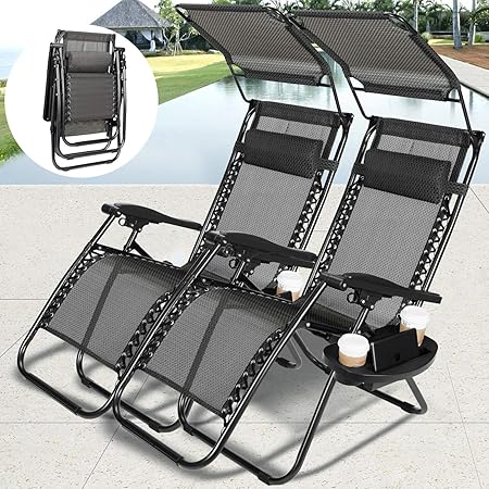 Each patio chair come with cup holder trays to place drinks, magazines, phones/tablets, or other small items for convenient accessibility. Shop our vast selection of products and best online deals. Belleze 2 pack zero gravity chairs canopy shade cover adjustable headrest pillows ergonomic recliner phone slots, brown. Reclining with your legs above your heart level adds to relaxation and takes most of the weight off your back. It's almost like sitting on a very comfortable trampoline molded to your body.